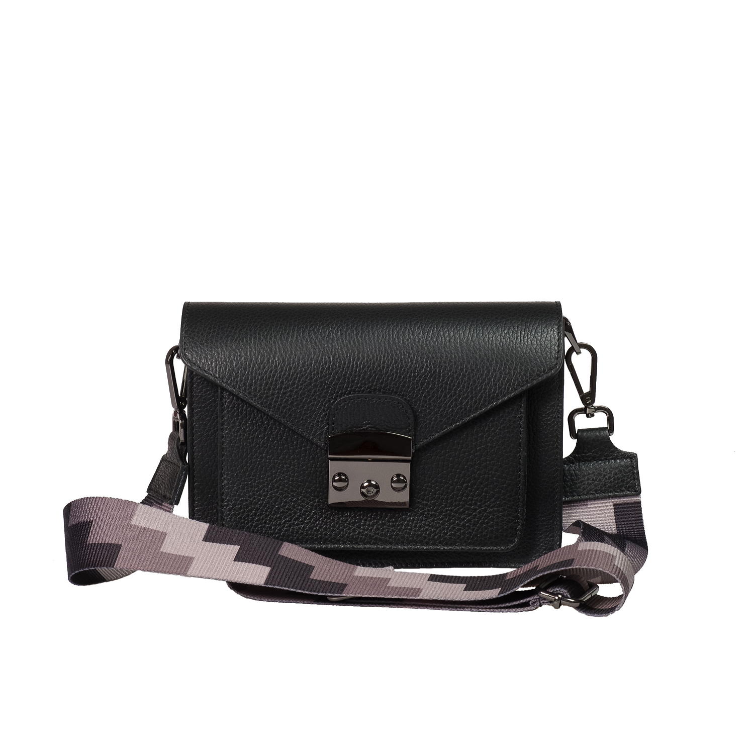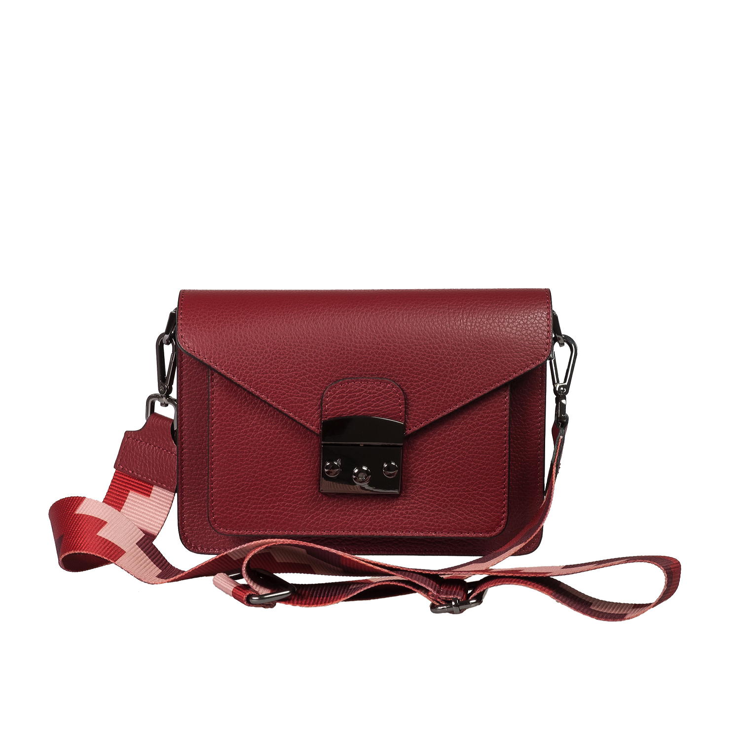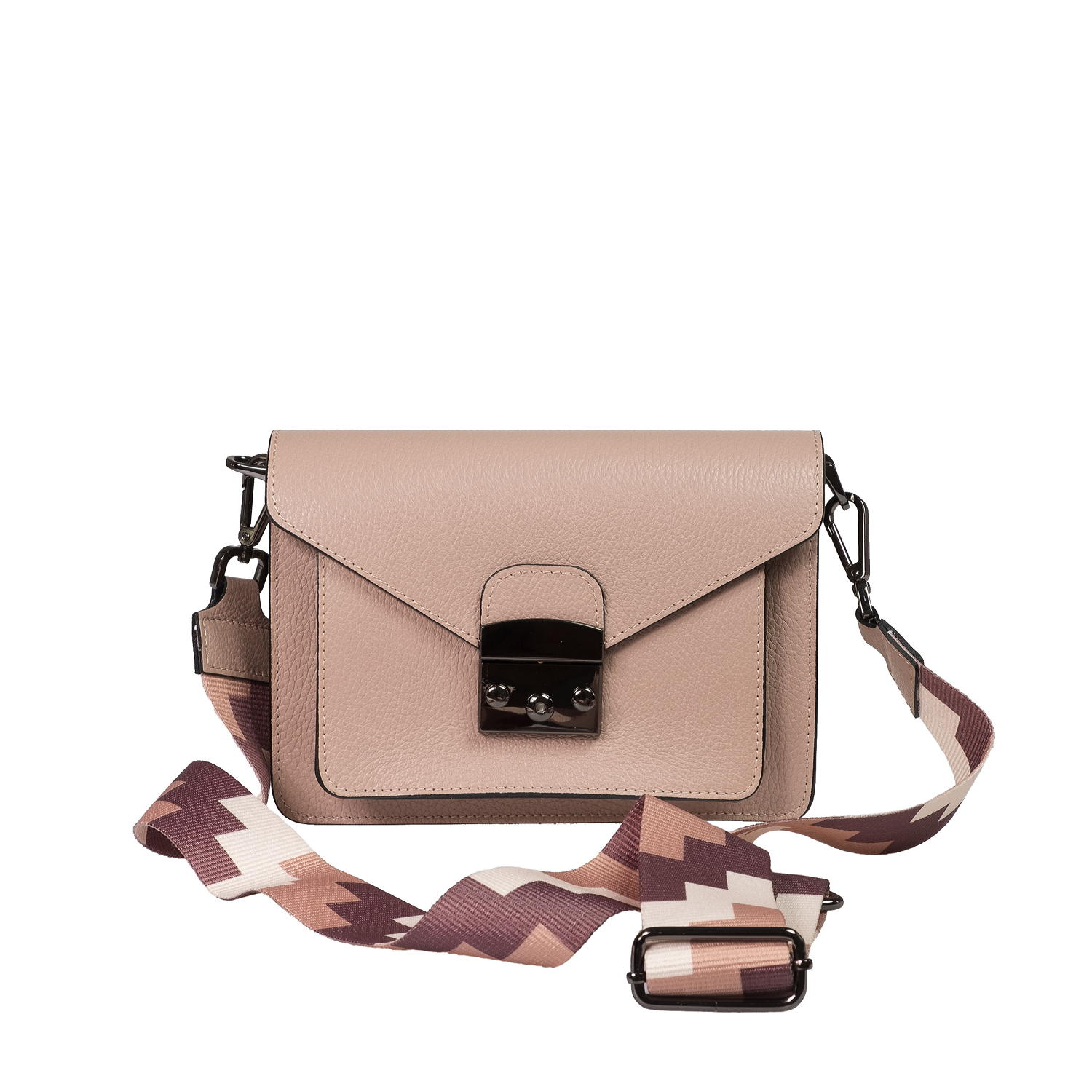 Compact pebbled leather crossbody bag. Accordion-style. The crossbody strap is adjustable and made of coloured cotton mesh with matching leather ends.